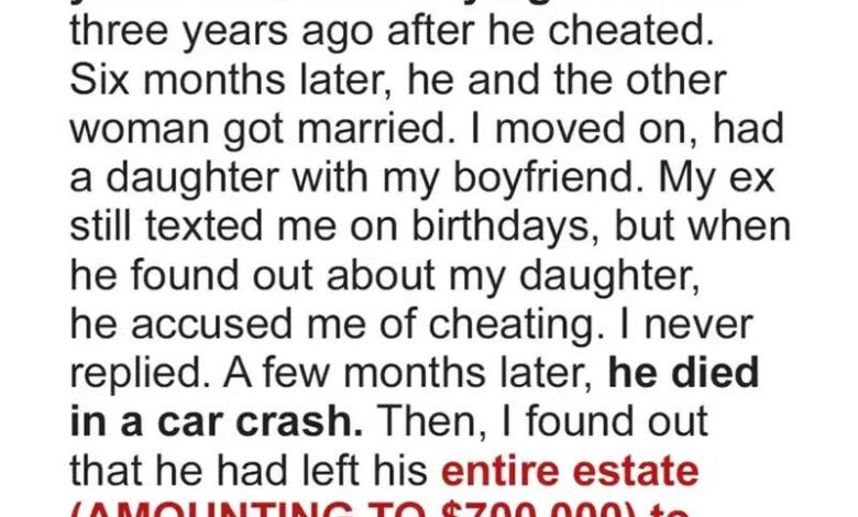 After 20 years with my ex, Jack, I left when he cheated. Six months later, he married the other woman, Lauren. I moved on, had a daughter, Iris, with my boyfriend. Jack texted occasionally but accused me of cheating upon learning about Iris. I ignored him. Then, he died in a car crash, leaving his entire $700,000 estate to me.