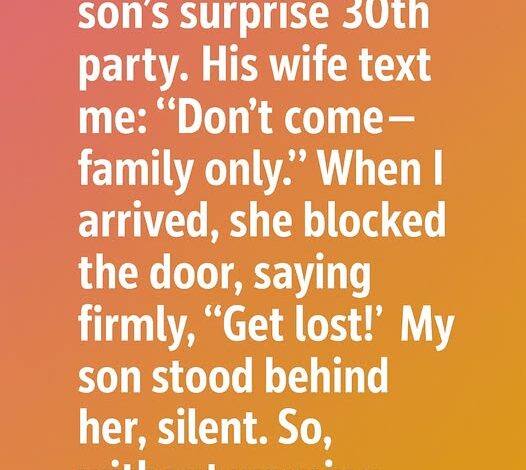 I (55F) funded my son’s surprise 30th birthday party. His wife texted, “Don’t come — family only.” At the venue, she blocked me, saying, “Get lost!” My son stood silently behind her. Heartbroken but composed, I left quietly, making one final stop that shifted everything.