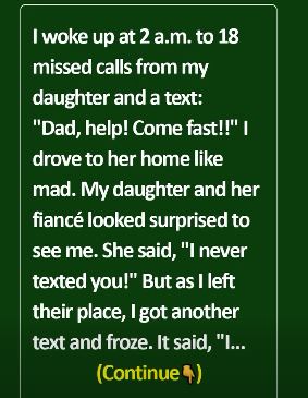 I woke up at 2 a.m. to 18 missed calls from my daughter and a text: “Dad, help! Come fast!!” I drove to her home like mad. My daughter and her fiancé looked surprised to see me. She said, “I never texted you!”