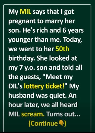 My MIL says that I got pregnant just to marry her son. He’s rich and six years younger than me. Last week, she invited us to her 50th birthday. She looked at my 7-year-old son, then told all the guests, “Here is my DIL and her lottery ticket!”