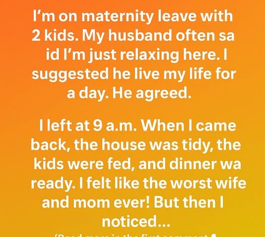 I’m on maternity leave with 2 kids. My husband often said I’m just relaxing here. I suggested he live my life for a day. He agreed. I left at 9 a.m. When I came back, the house was tidy, the kids were fed, and dinner was ready. I felt like the worst wife and mom ever! But then I noticed…