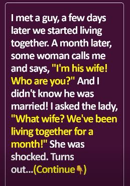 I met a guy, a few days later we started living together. A month later, some woman calls me and says, “I’m his wife! Who are you?” And I didn’t know he was married! I asked the lady, “What wife? We’ve been living together for a month!” She was shocked. Turns out… he’d been leading a double life.