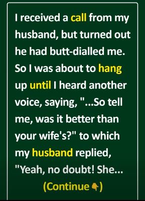 Last week he butt-dialed me during lunch. I heard him rave about a woman’s cooking—turns out a coworker makes his meals. Then she asked, “Better than your wife’s?” He laughed: “No doubt! Hers is tasteless for starters.”