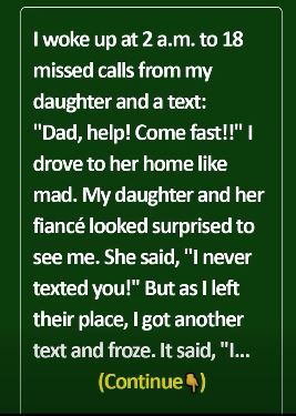 I woke up at 2 a.m. to 18 missed calls from my daughter and a text: “Dad, help! Come fast!!” I drove to her home like mad. My daughter and her fiancé looked surprised to see me. She said, “I never texted you!”