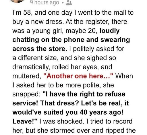 Then the owner, a woman my age, emerged from the back. She’d heard everything and calmly replayed the store’s audio, exposing her daughter’s behavior. The clerk’s defiance crumbled. The owner apologized sincerely, gave me the dress in my size, and invited me to her café next door. Over coffee, we watched the young woman perform a humbling task outside. “Consequences teach best,” the owner said. What began in stress became an afternoon of connection.