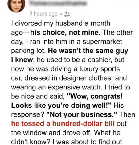 Weeks later, she spotted him exiting a luxury sports car, smirking as he pressed a $100 bill into her hand—a “parting gift.” A blue smiley face in the corner stopped her cold: her own mark from years ago on a bill from her grandfather’s $200,000 inheritance, which she’d humbly declined.