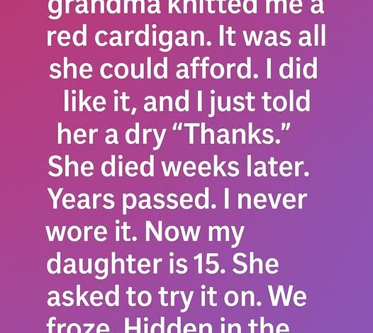 Years passed. The cardigan stayed folded in a drawer. Then my 15-year-old daughter asked to try it on. We froze. In the pocket: a tiny envelope with my name in Grandma’s handwriting.