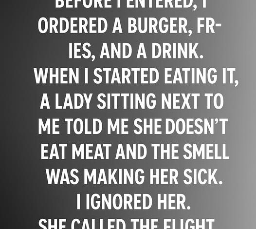 On an 8-hour flight, I boarded with a burger, fries, and drink. As I ate, the woman beside me—a vegetarian—said the meat smell made her nauseous. I ignored her. She summoned the attendant, who confirmed: pre-purchased food was allowed. She sighed, turned away. I ate on, smug yet irritated.