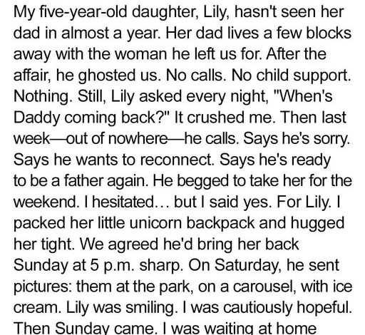 After three years of silence, my ex-husband Leo begged for a weekend with our daughter Lily. “To make things right.” Against my gut, I packed her yellow backpack—pajamas, snacks, teddy, favorite dress. A tiny hope flickered: maybe he’d finally be her dad.