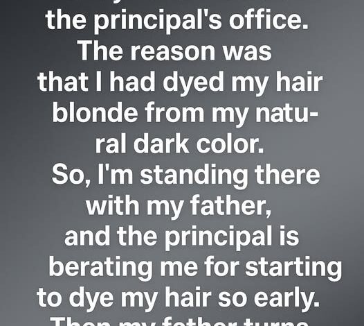 Called to the principal’s office, heart racing—I’d always followed rules. Issue? My new blonde hair. She cited policy, appearance standards.