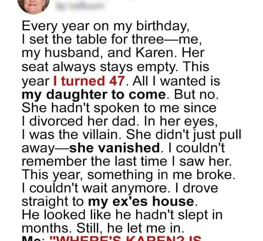 On her 47th birthday, widowed mother set table for three—empty chair for Karen, silent two years since she left Nigel unexplained. Brad lit candles; she wished, called—voicemail.