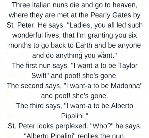 At the Pearly Gates, three Italian nuns arrived together after long, faithful lives. St. Peter smiled as he checked his list.