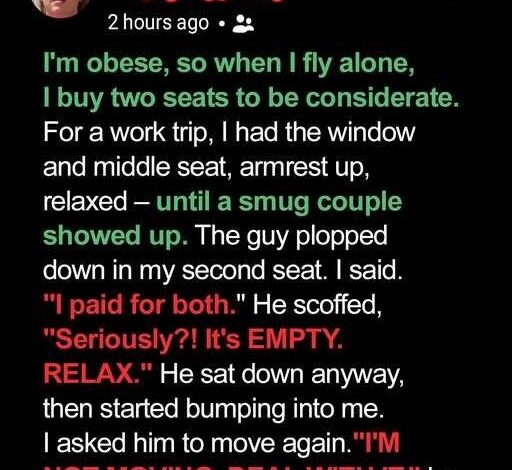I’m obese, so I bought two seats on a work flight—not for luxury, but for peace. I paid extra so I wouldn’t spend three hours pressed against a stranger who resented my existence.