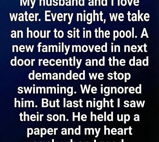 While floating quietly, I noticed their ten-year-old son standing near the fence, shaking as he held out a note. It read: “Please stop using the pool at night. My dad says he can’t control himself when he gets angry.”