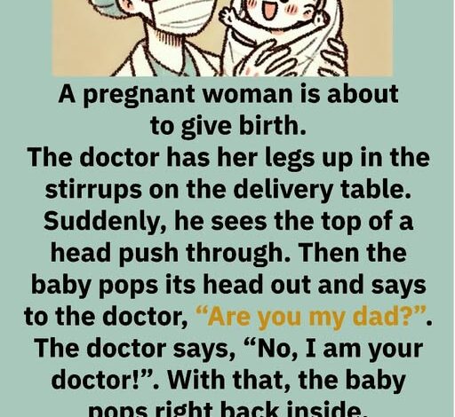 The doctor has her on the delivery table, legs up in the stirrups. Suddenly, he sees the top of a head push through. Then the baby pops its head out and says to the doctor, “Are you my dad?”.