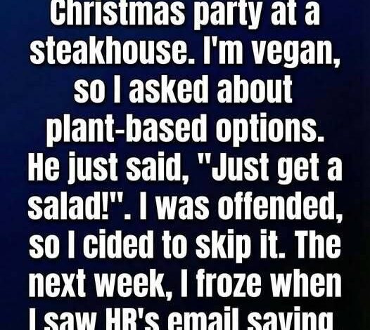 When my boss announced the company Christmas party would be at a steakhouse, I laughed—then remembered: I’m vegan.