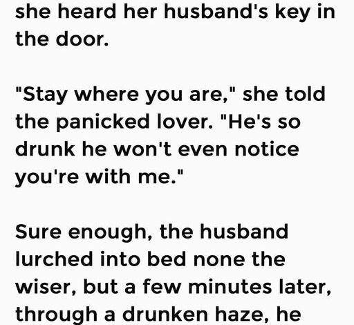 A wife was in bed with her lover when she heard her husband’s key in the door.