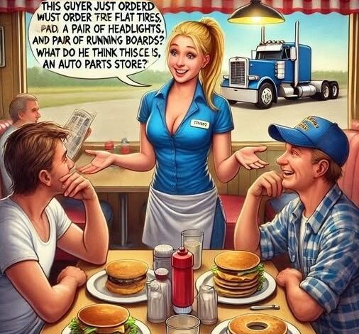 A trucker walks into a truck stop café and orders, “Three flat tires, a pair of headlights, and a pair of running boards.”