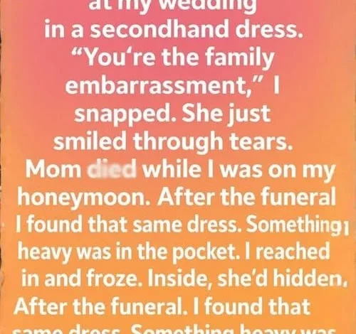 When I think of my wedding day, the memory that stands out isn’t the vows or the photos—it’s my mother walking in wearing a thrift-store dress. A wave of embarrassment hit me, irrational and cruel, and I let it win. I made careless remarks, trying to impress others. She didn’t argue. She only smiled softly—the kind of smile worn by someone used to swallowing pain.