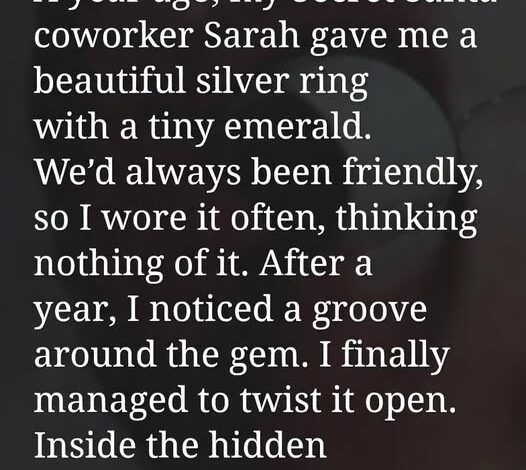 A year ago, my Secret Santa coworker, Sarah, gave me a silver ring with a tiny emerald. We were friendly at work, nothing more, so I wore it often without much thought. Almost a year later, I noticed a faint groove around the stone. Curious, I twisted it—and the ring opened.