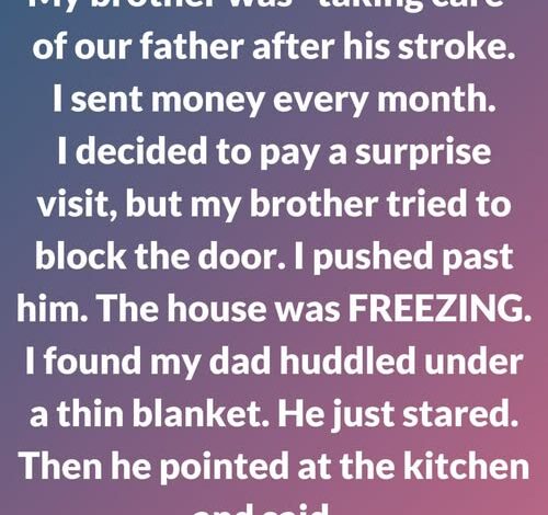 The cold hit me instantly. Dad sat curled on the couch under a damp, thin blanket, staring ahead. His trembling finger lifted.