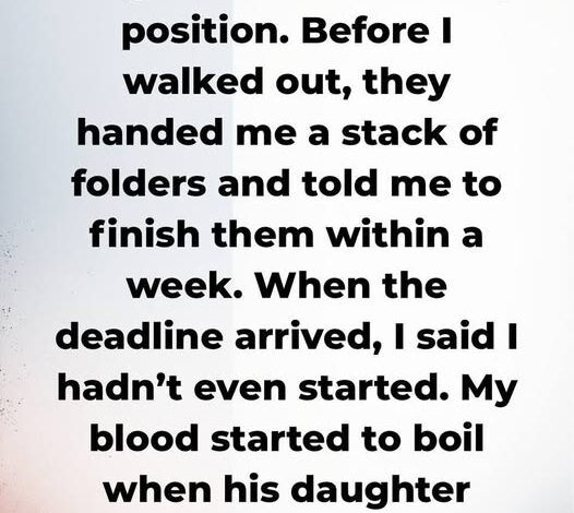 I lost my job so my boss’s daughter could take my position. Before I left, they handed me a stack of folders and told me to finish everything by the end of the week. When the deadline came, I admitted I hadn’t touched them. That’s when she coldly told me I was “obliged to finish” since they were still paying me — hinting that maybe I was being let go for being unprofessional.