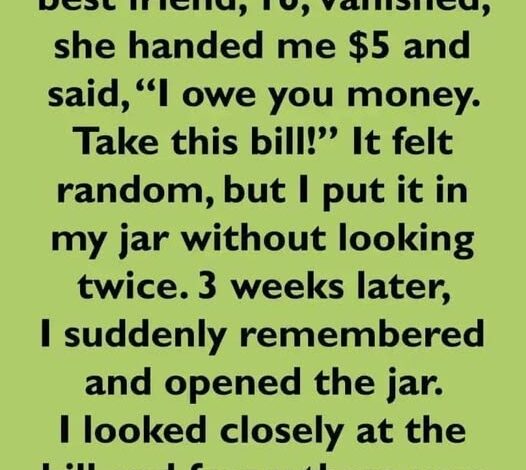Three weeks later, I suddenly remembered and opened the jar. I looked closely at the bill and froze: there was a message written in tiny blue ink along the edge.
