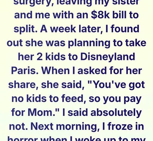 A week later, I called my sister to confirm her half, only to hear kids cheering in the background. That’s when she casually mentioned she was planning a trip to Disneyland Paris with her two children.