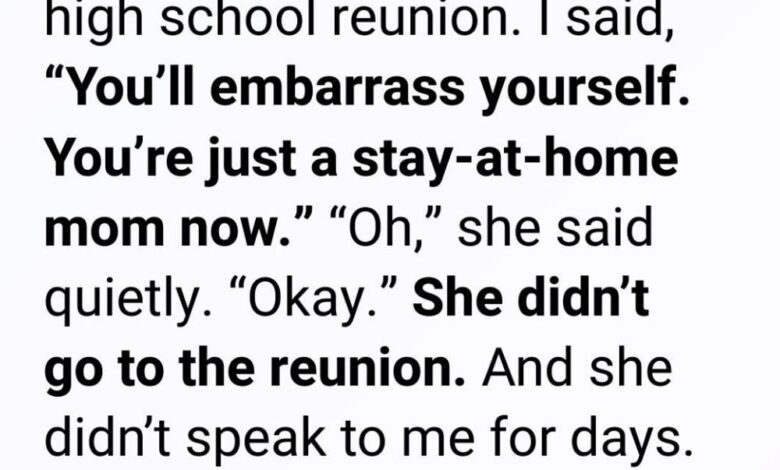 “Why?” I asked. “So you can tell everyone you stay home and wipe noses all day? Your classmates are probably surgeons, lawyers, CEOs by now. What are you going to say—that you’re just a stay-at-home mom?”