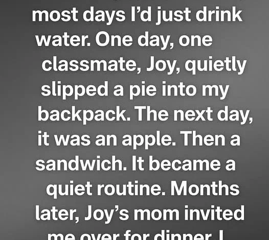 Months later, my classmate Joy invited me to dinner. At her house, her mom placed a freshly baked pie on the table — the same kind I’d been finding in my bag. Suddenly, I understood.