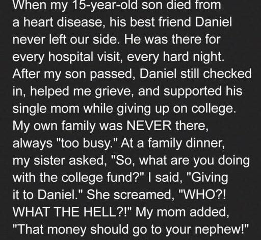 When my 15-year-old son died from heart disease, his best friend Daniel never left our side. He showed up to every hospital visit, stayed through the hardest nights, and after my son passed, he kept checking on me while helping his own single mom. My relatives, meanwhile, were always “too busy.”