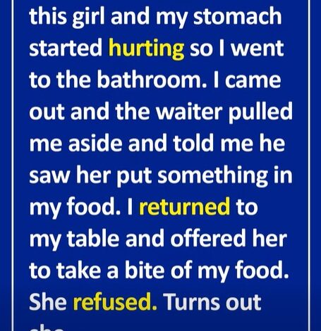 When I came out, the waiter pulled me aside and quietly said, “I saw her put something in your food.”