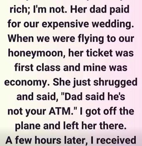 At the airport, Darren noticed his ticket was Economy while hers was First Class. Assuming it was a mistake, he mentioned it—only for her to reply casually, “Dad said he’s not your bank.”