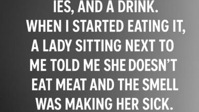 On an 8-hour flight, I boarded with a burger, fries, and drink. As I ate, the woman beside me—a vegetarian—said…